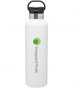 24 oz powder coated double wall 18/8 stainless steel thermal bottle with copper vacuum insulation, threaded gear-shaped insulated lid and carrying handle Complies with FDA, Prop 65. 11.25" H x 3" W