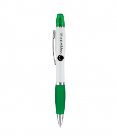 Twist-action ballpoint pen. Curvaceous glossy white barrel with translucent color rubber grip and matching highlighter cap. Shiny silver accents. Black pen comes with yellow highlighter ink. 5 11/16" L x 17/32" Diameter
